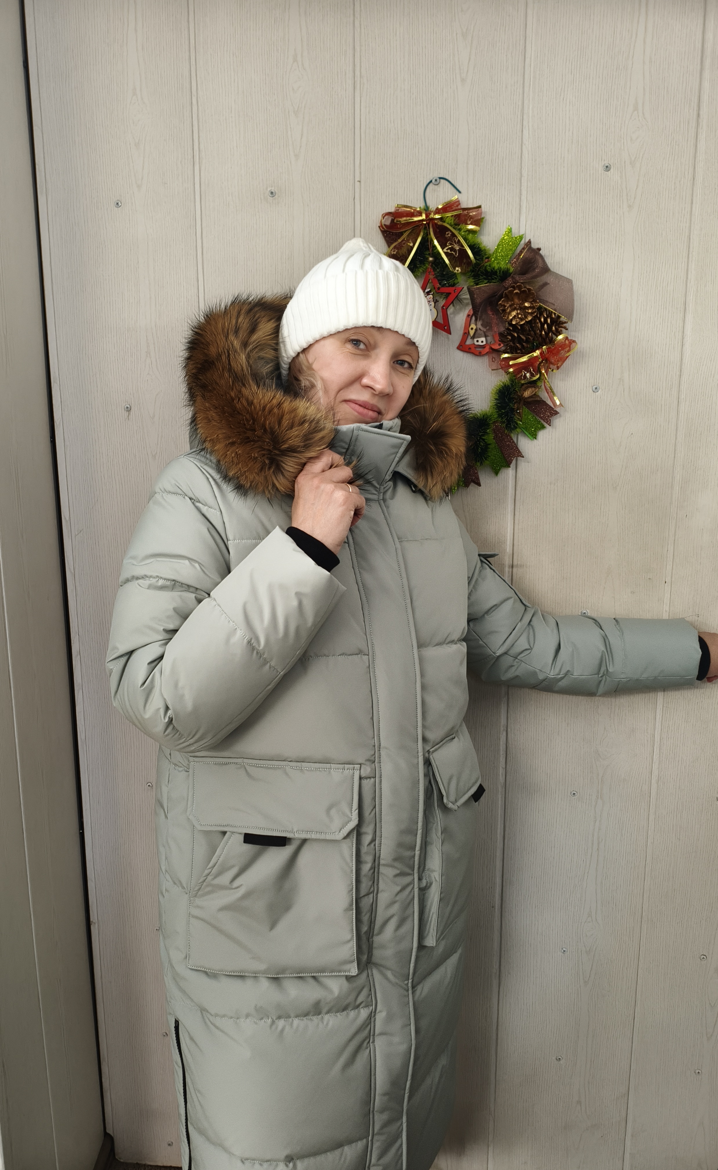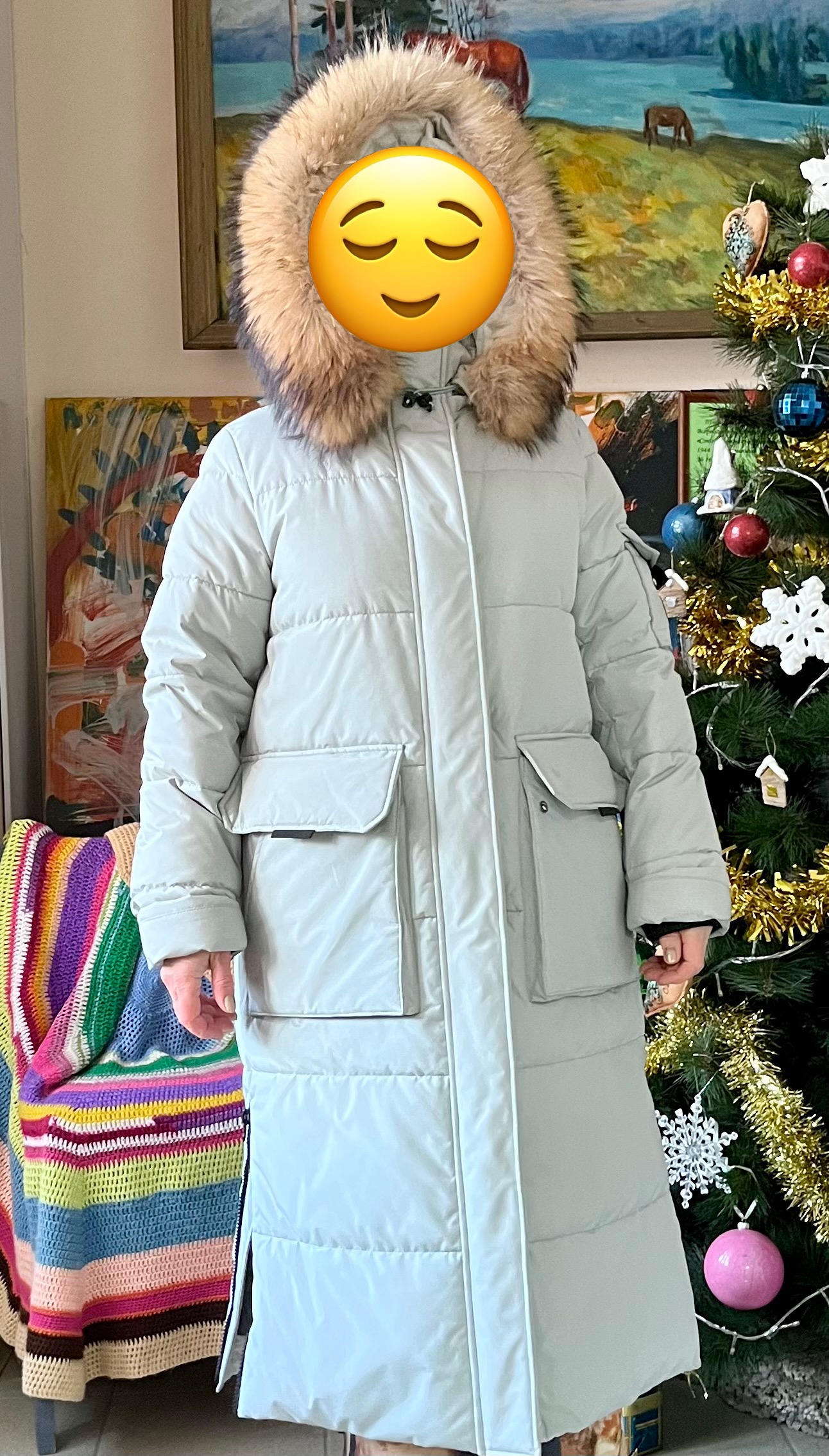 Очень тёплый, удобный и красивый пуховик. Мех шикарный. На 44 подошел 44 . Очень довольна покупкой. Спасибо большое за качественные вещи.