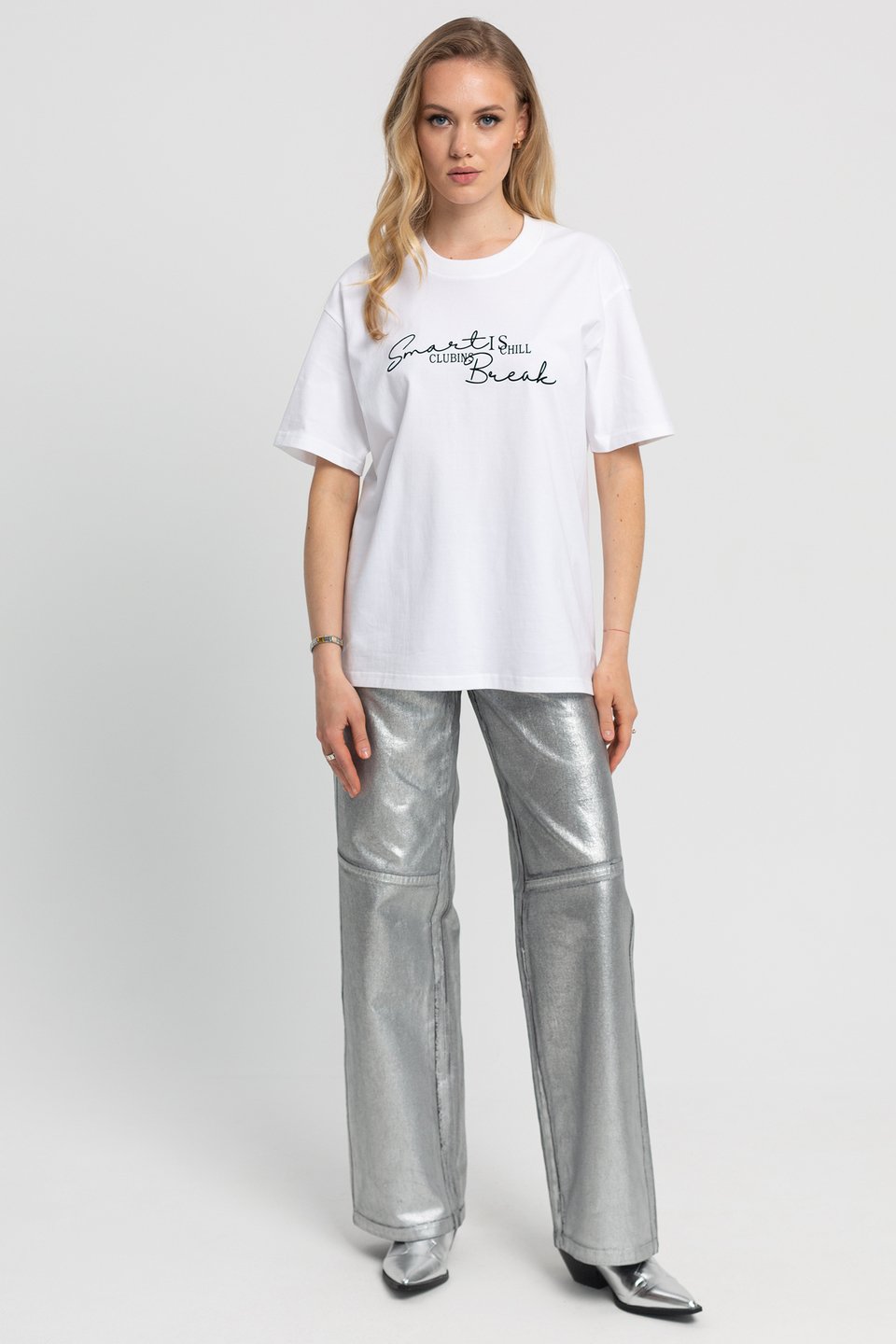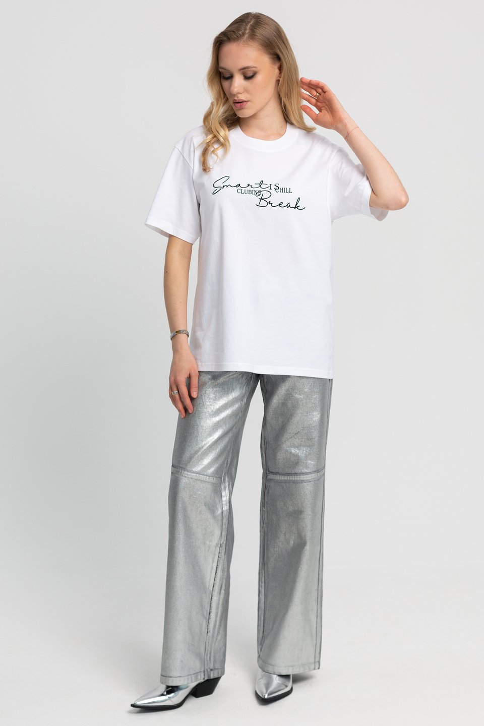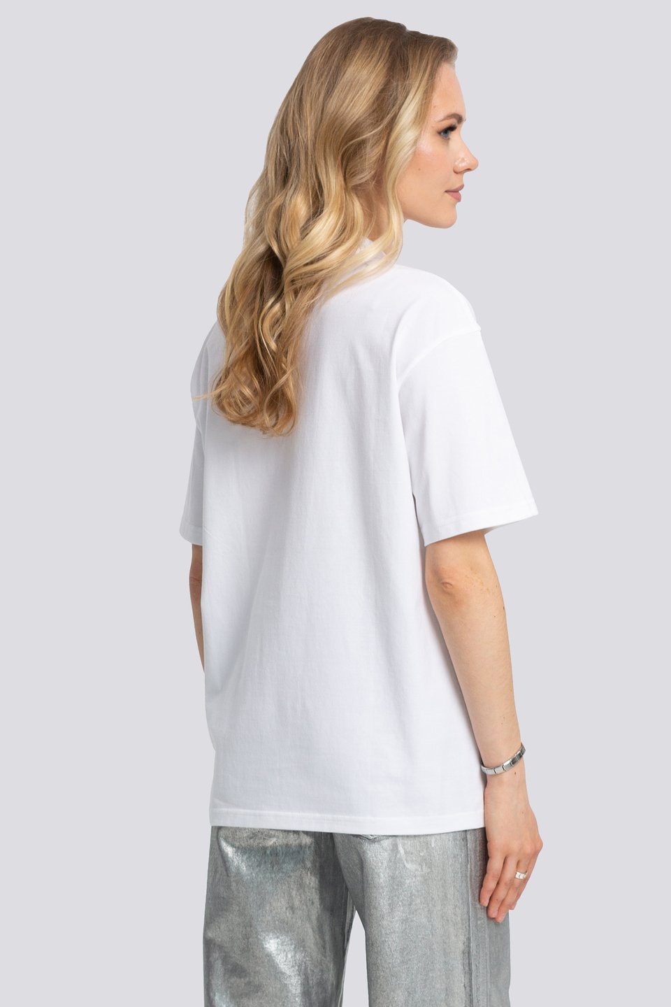 Эта модная футболка с коротким рукавом - идеальный выбор для тех, кто следит за последними тенденциями в мире моды. Базовая, белая, но в то же время стильная. Принт на передней части делает её настоящим хитом сезона. Благодаря свободному крою и оверсайз-стилю, эта футболка будет комфортна и удобна в любых ситуациях. Универсальный дизайн позволяет сочетать её с различными видами одежды, создавая уникальные образы. Этот трендовый предмет одежды станет неотъемлемой частью гардероба любой молодой женщины.