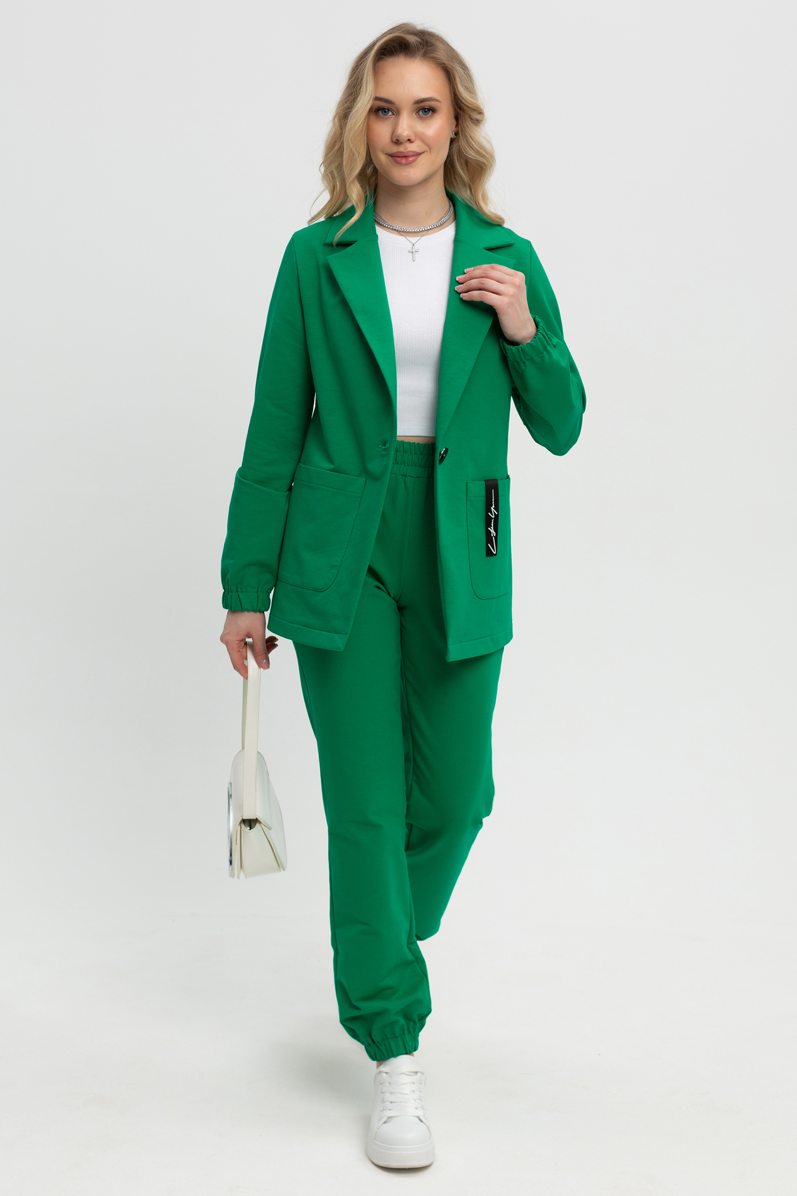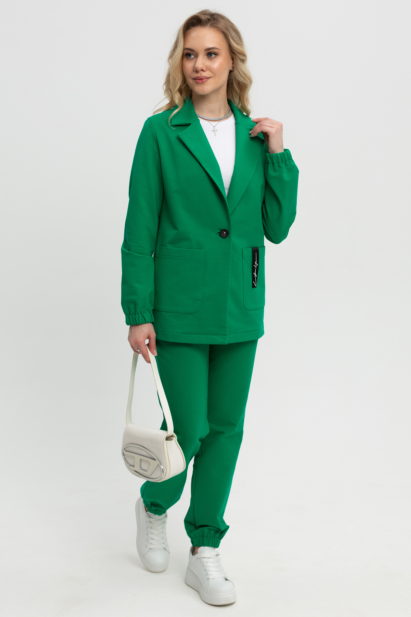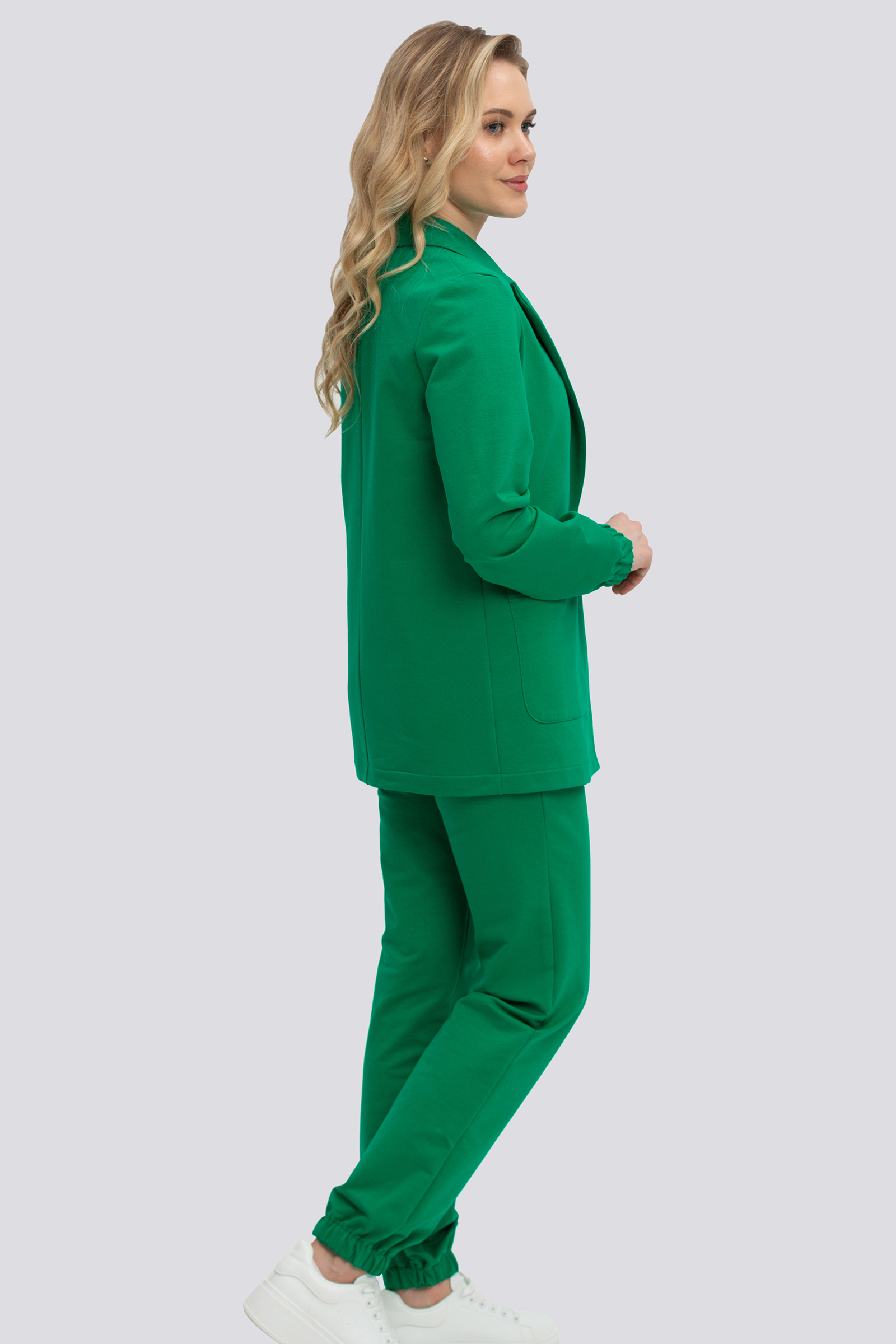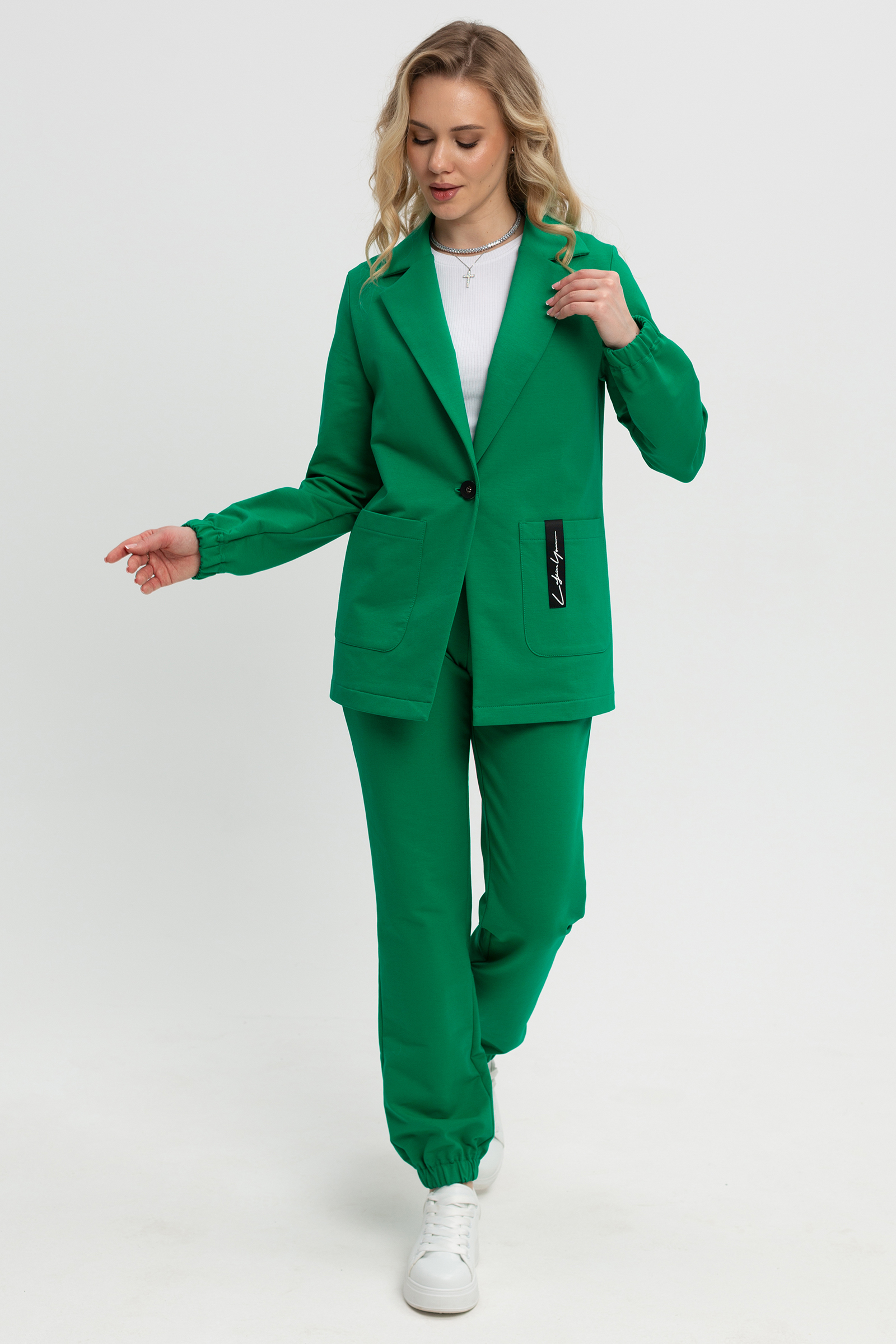 подружился с брюками спортивного стиля. Жакет прямого силуэта, умеренного