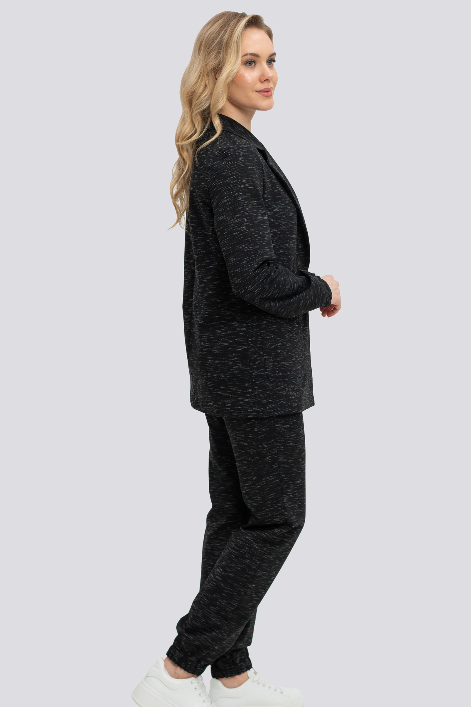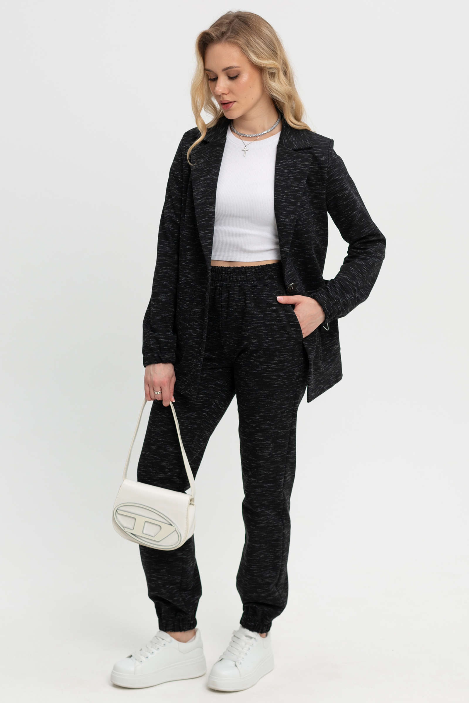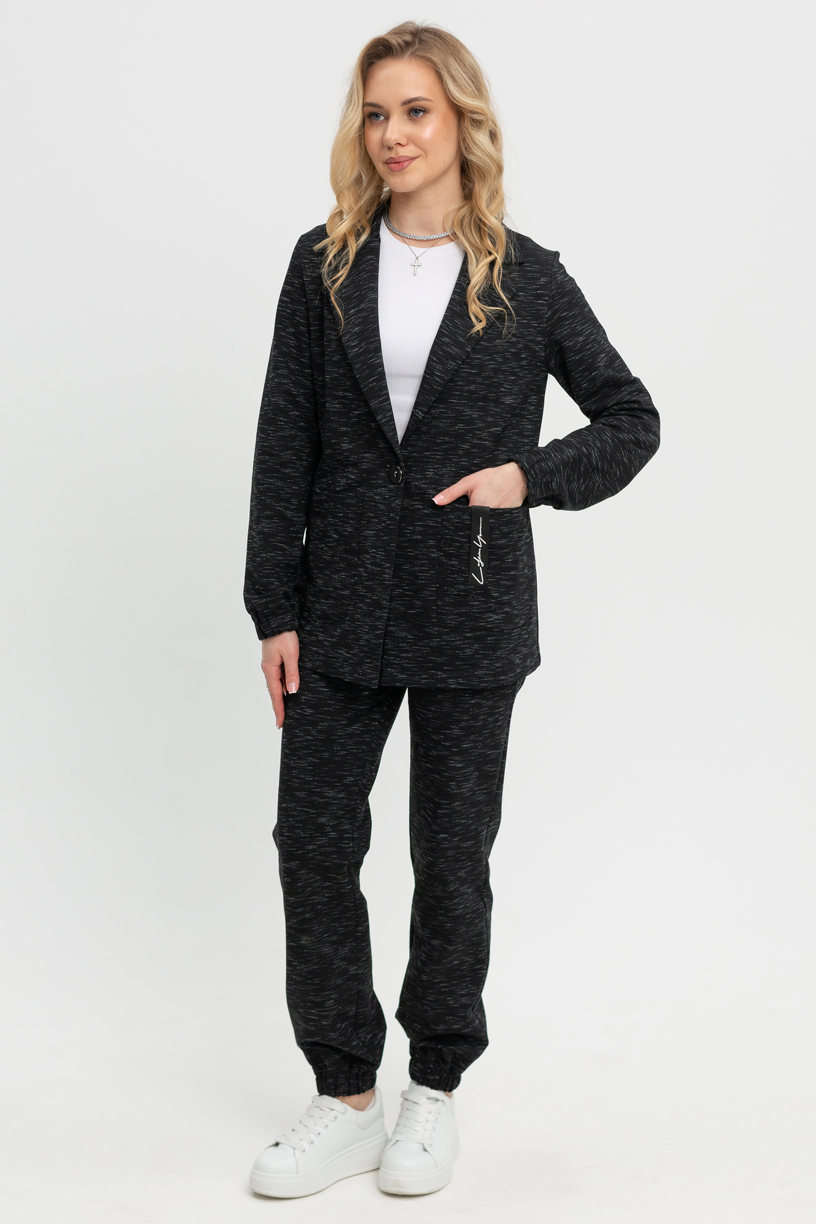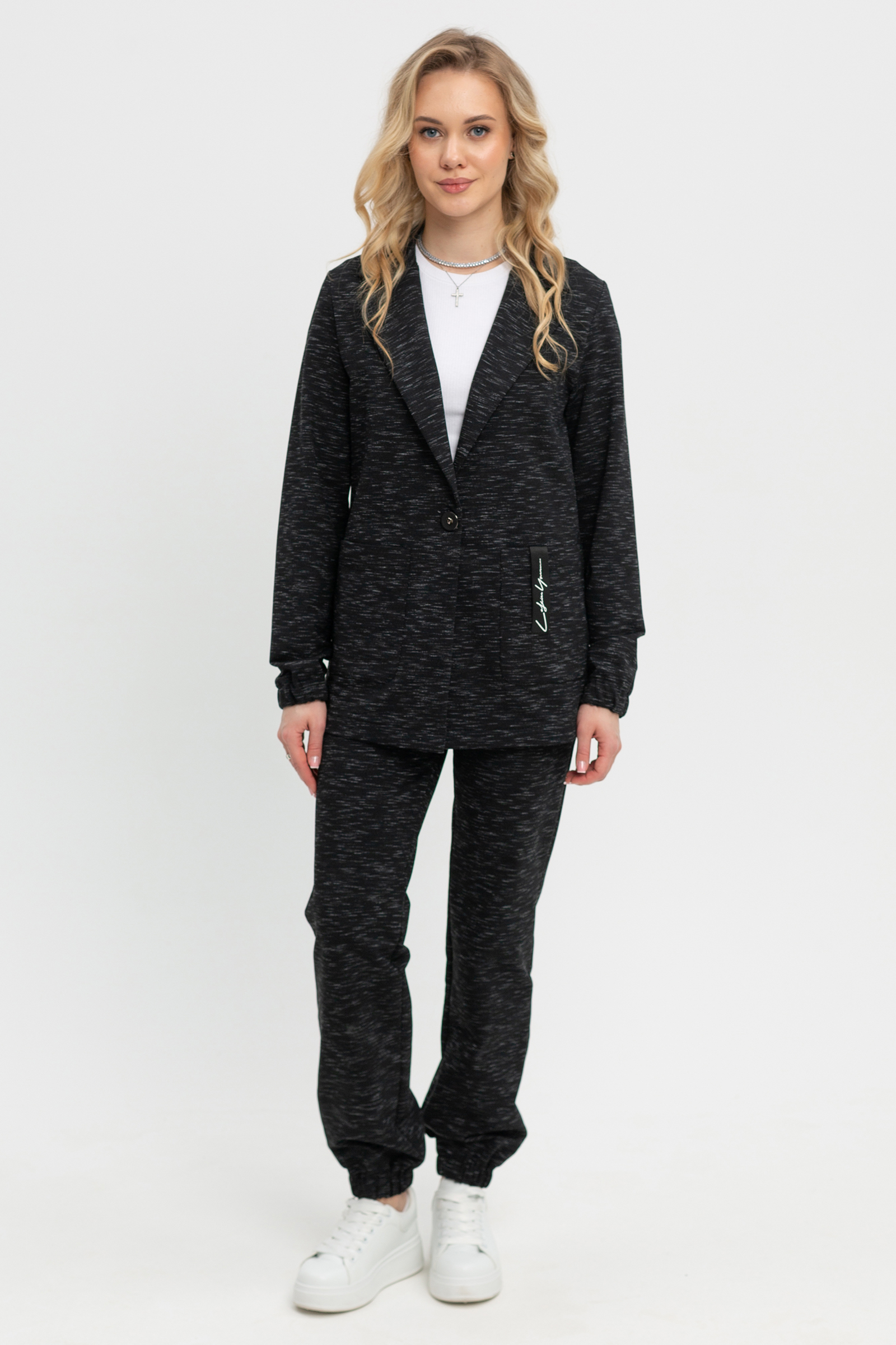 Костюмы в стиле спорт шик - любимая одежда современных покупательниц. Они удобные, комфортные и нарядные одновременно. Классический жакет отлично подружился с брюками спортивного стиля. Жакет прямого силуэта, умеренного объема, по низу рукава резинка. Воротник пиджачного типа придает образу элегантности, строгости. Брюки – джоггеры с резинкой по линии низа немного расслабляют. Накладные карманы добавляют уют. Яркая цветовая палитра разбавлена новинками – пепельным и черным меланжем, которые смотрятся очень оригинально. Учитывая все особенности этой модели, она несомненно станет незаменимой для своей обладательницы. Состав трикотажа: 75% хлопок, 20% полиэстер, 5% спандекс.