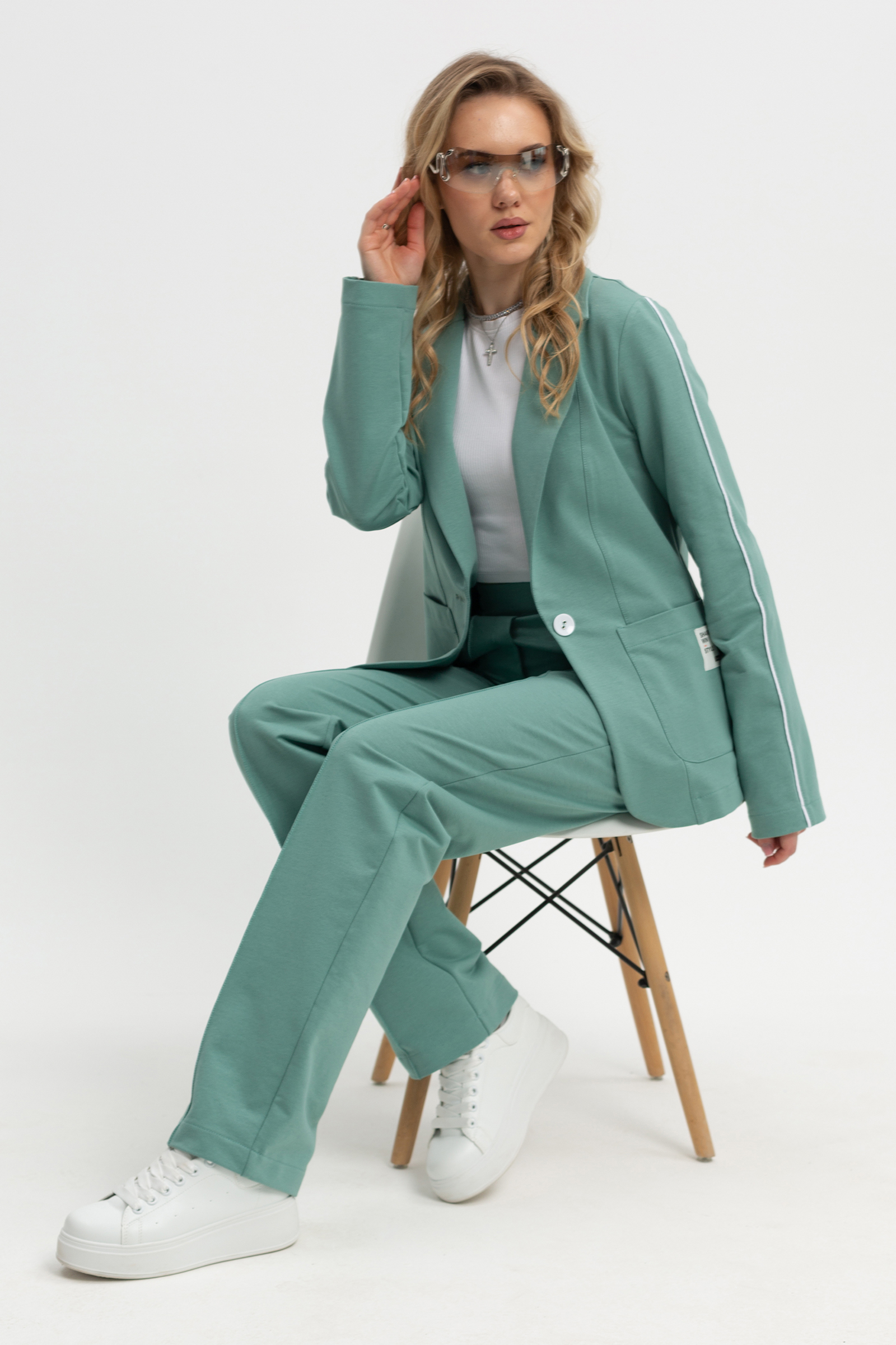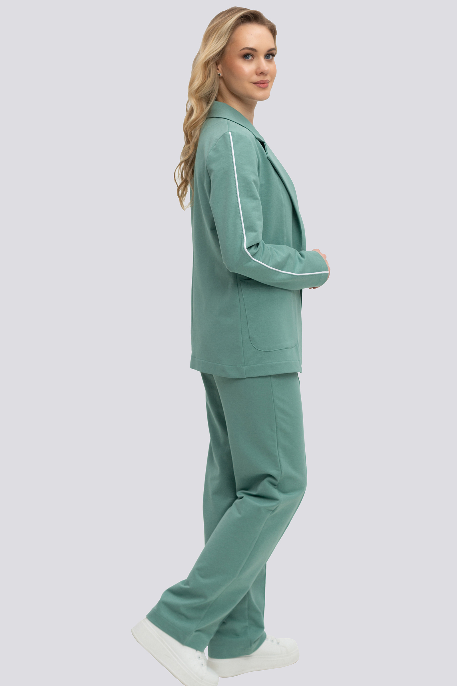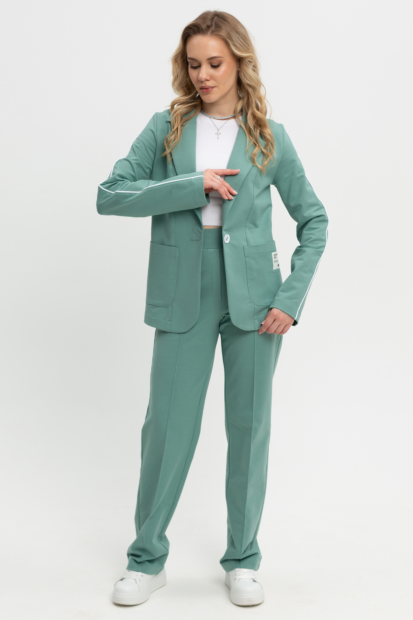 Классический женский костюм есть у каждой модницы. Но теперь они стали гораздо удобнее и практичнее в носке, т.к. шьются из трикотажных тканей. Таким образом подобный костюм мы можем использовать как в качестве делового, так и повседневного. Брюки классического кроя, со стрелками, пояс частично на резинке. Воротник пиджачного типа придает образу элегантности, строгости. Но все же жакет с легким намеком на спорт – белый кант по рукаву, белая фурнитура освежают дизайн, придают дерзости образу. Накладные карманы добавляют уют. Цветовая гамма разнообразна, новинка – расцветка серая «лапка» - очень универсальна и отлично сочетается с любым цветом. Состав трикотажа: 75% хлопок, 20% полиэстер, 5% спандекс.
