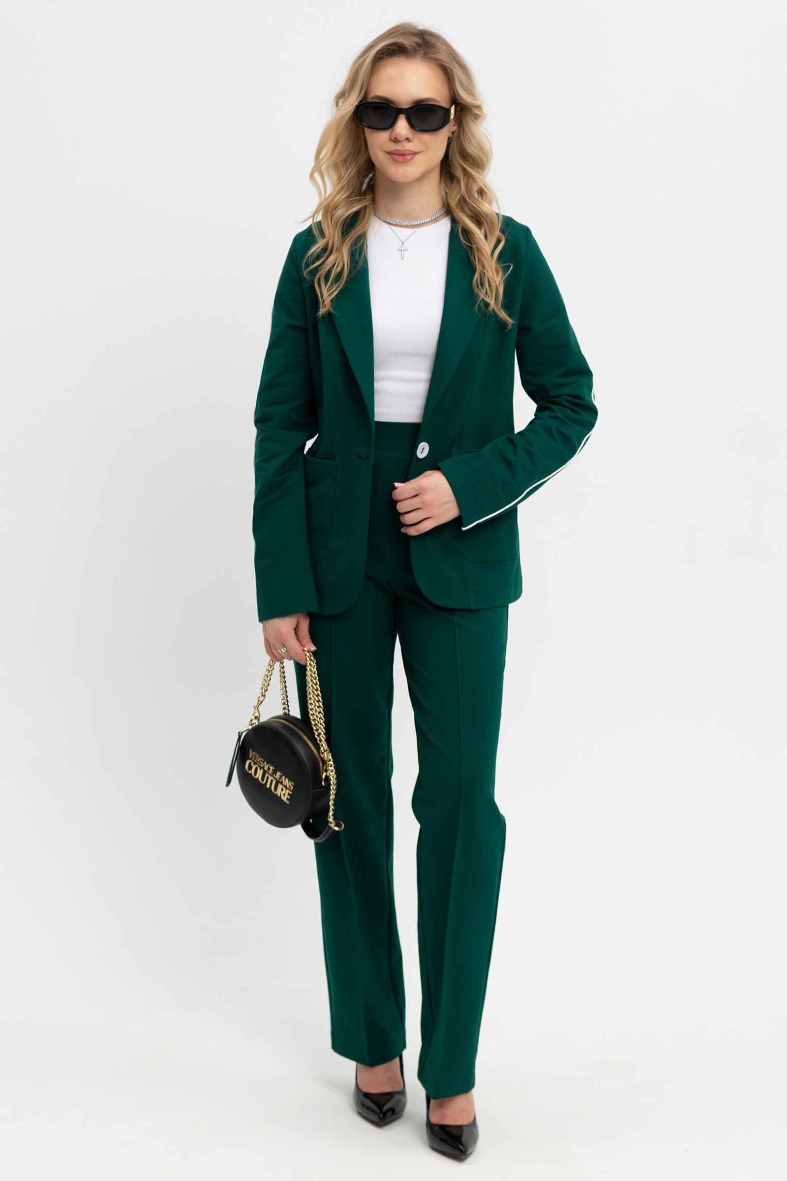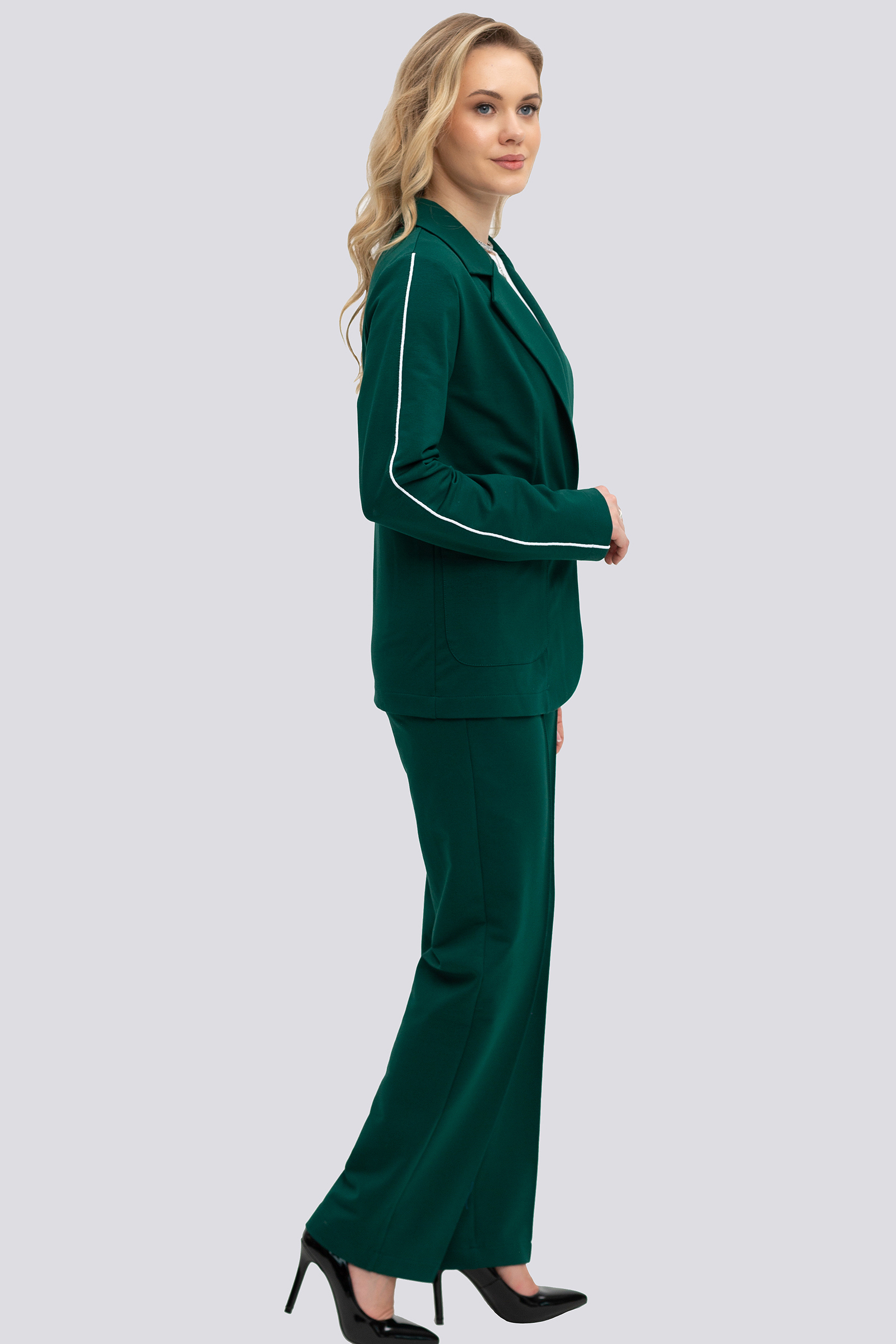 Классический женский костюм есть у каждой модницы. Но теперь они стали гораздо удобнее и практичнее в носке, т.к. шьются из трикотажных тканей. Таким образом подобный костюм мы можем использовать как в качестве делового, так и повседневного. Брюки классического кроя, со стрелками, пояс частично на резинке. Воротник пиджачного типа придает образу элегантности, строгости. Но все же жакет с легким намеком на спорт – белый кант по рукаву, белая фурнитура освежают дизайн, придают дерзости образу. Накладные карманы добавляют уют. Цветовая гамма разнообразна, новинка – расцветка серая «лапка» - очень универсальна и отлично сочетается с любым цветом. Состав трикотажа: 75% хлопок, 20% полиэстер, 5% спандекс.