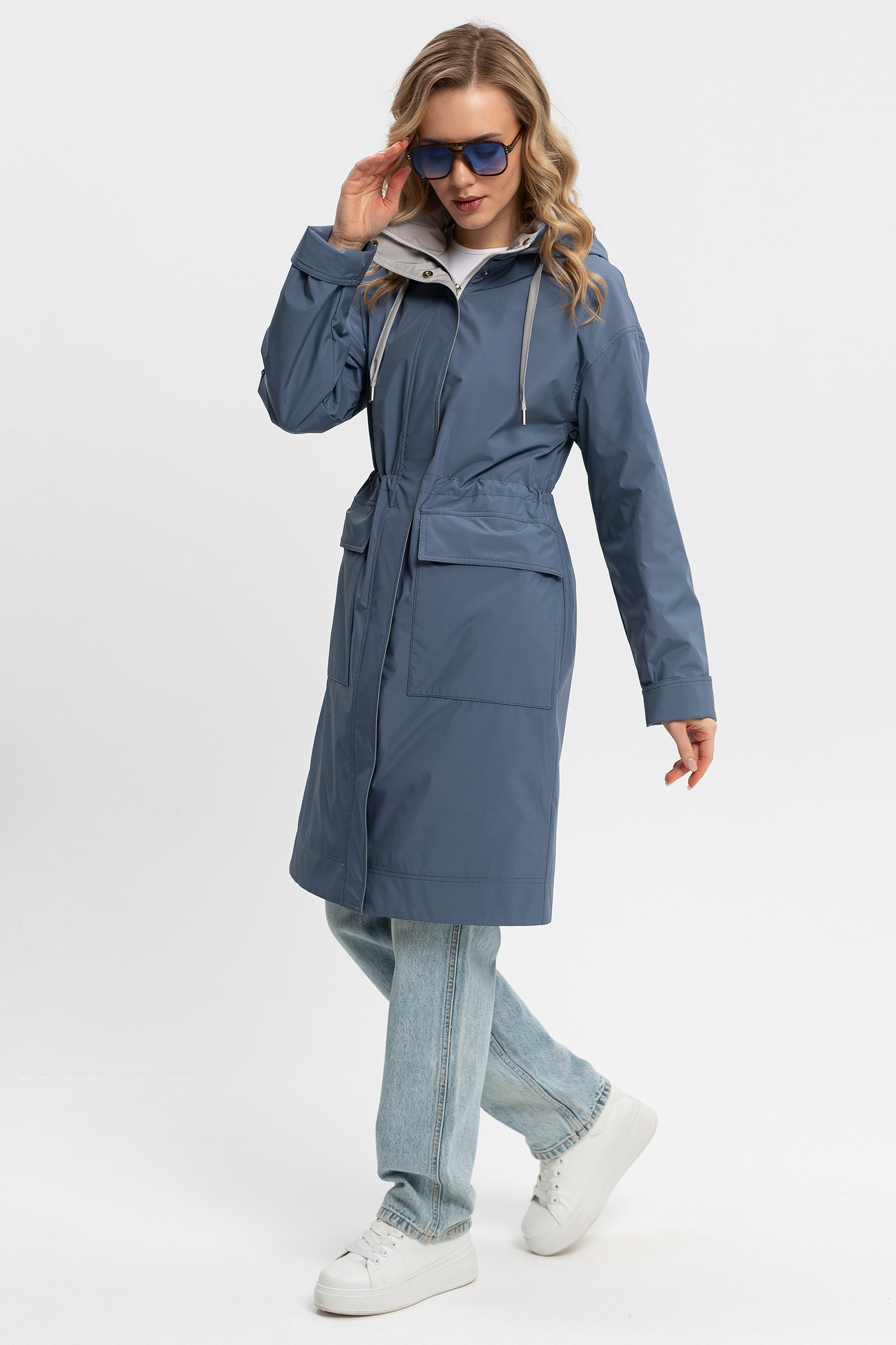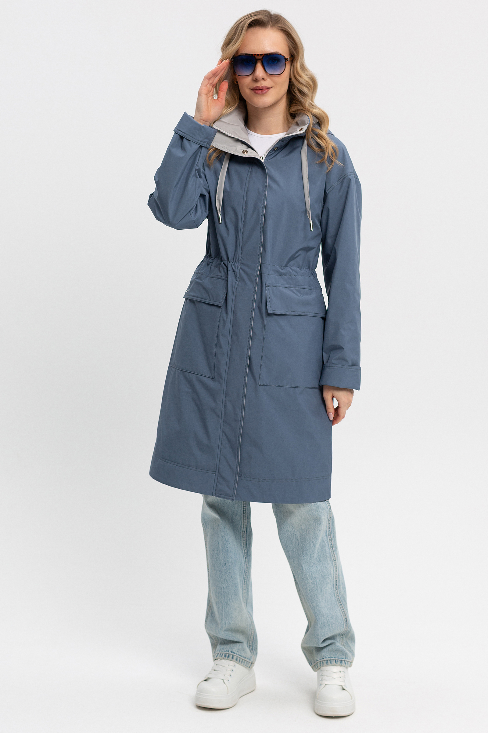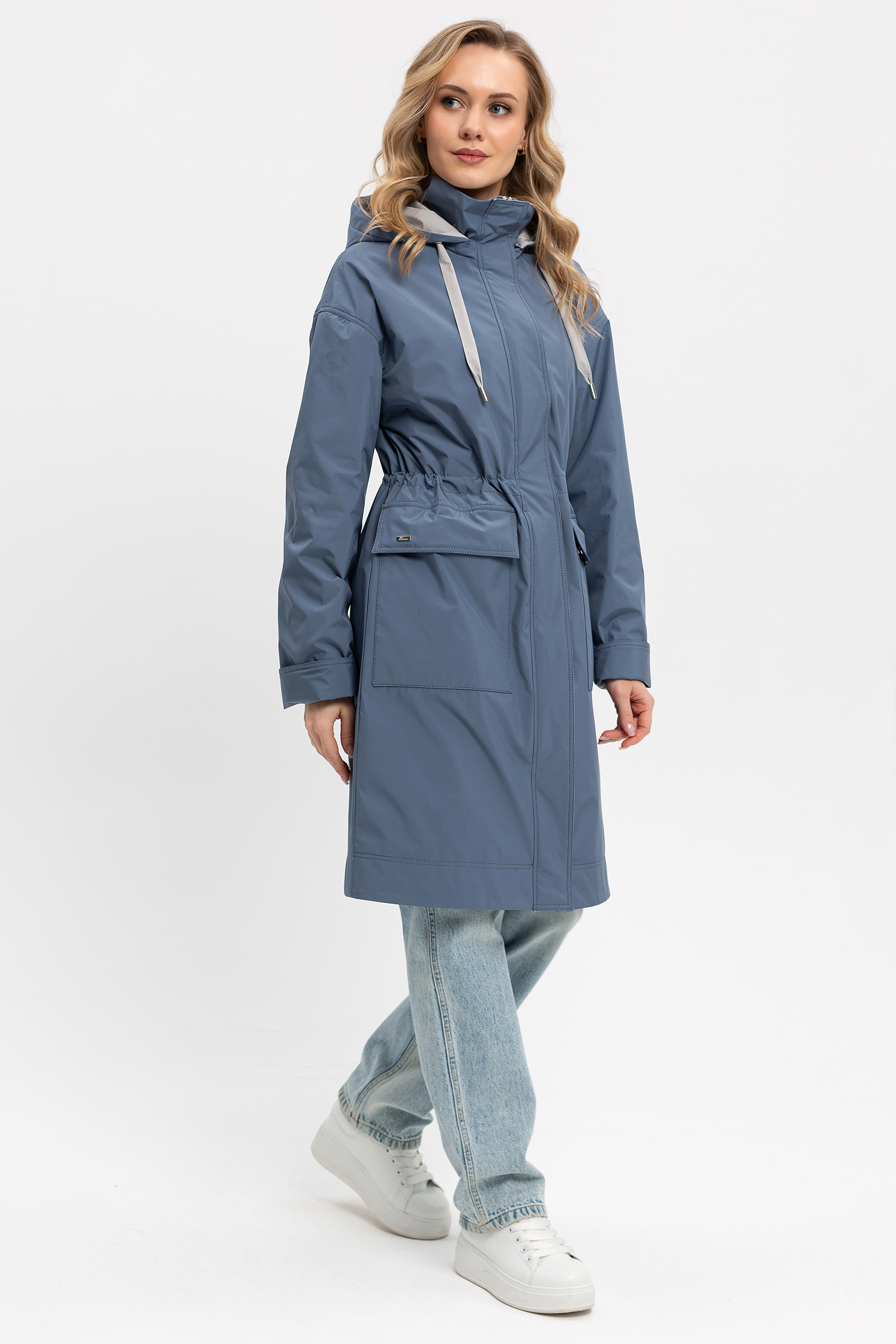 Женский плащ в полуспортивном городском стиле. Спущенная линия плеча, умеренный объем, прямой