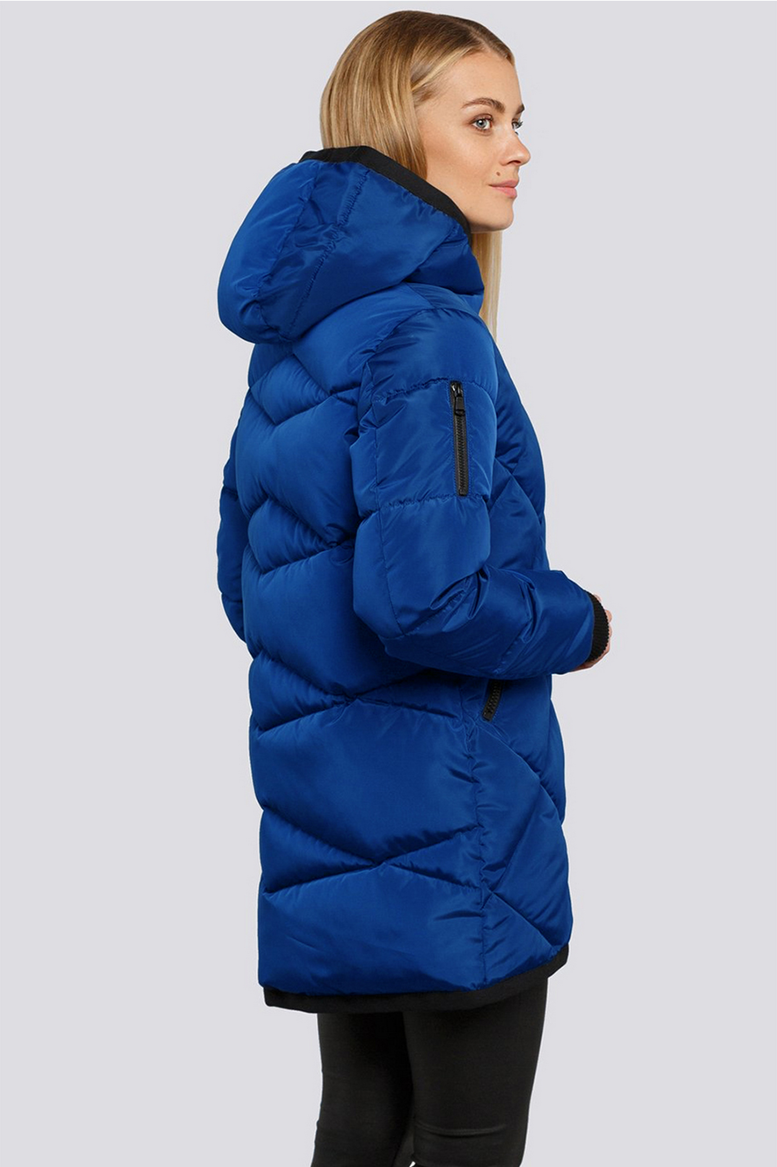 Универсальный хит –женская стеганая куртка с капюшоном из плотной плащевой ткани. Куртка прямого силуэта с ромбовидной стежкой на передней части изделия и фигурной стежкой на спинке. Центральная застежка на молнию, прорезные удобные карманы. Отделка трикотажной бейкой смотрится очень эффектно. В качестве утеплителя мягкий и практичный синтепух-синтетический пух. Температурный режим до -15.