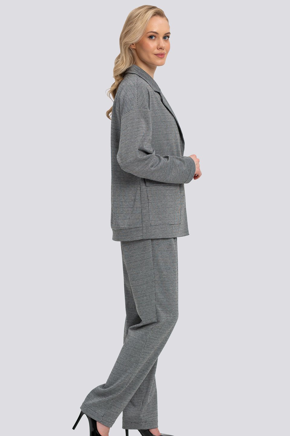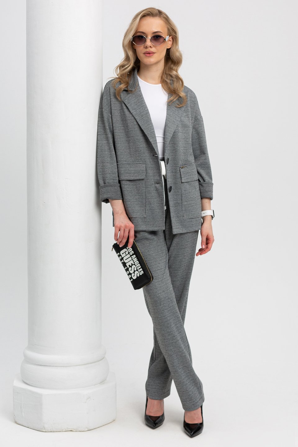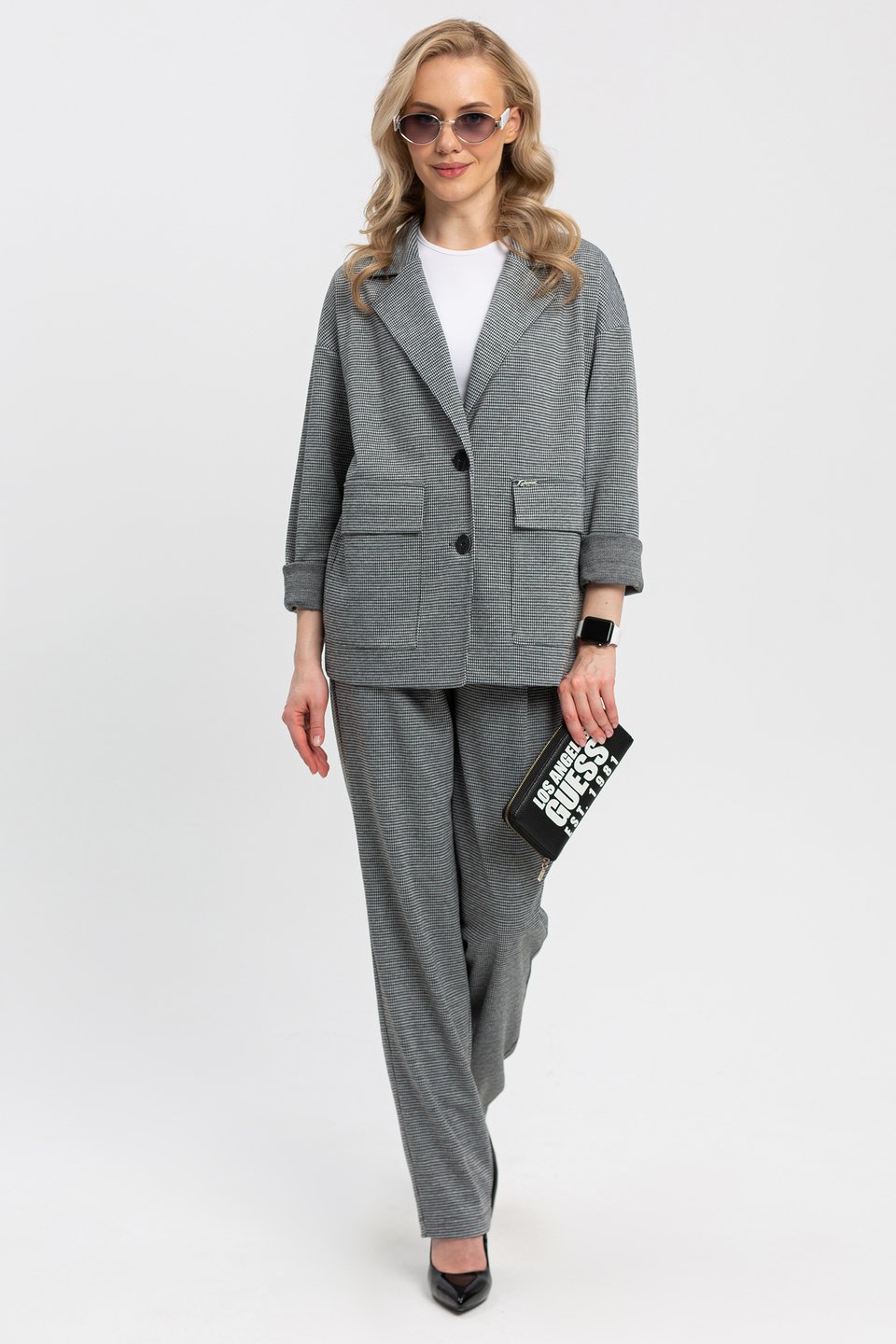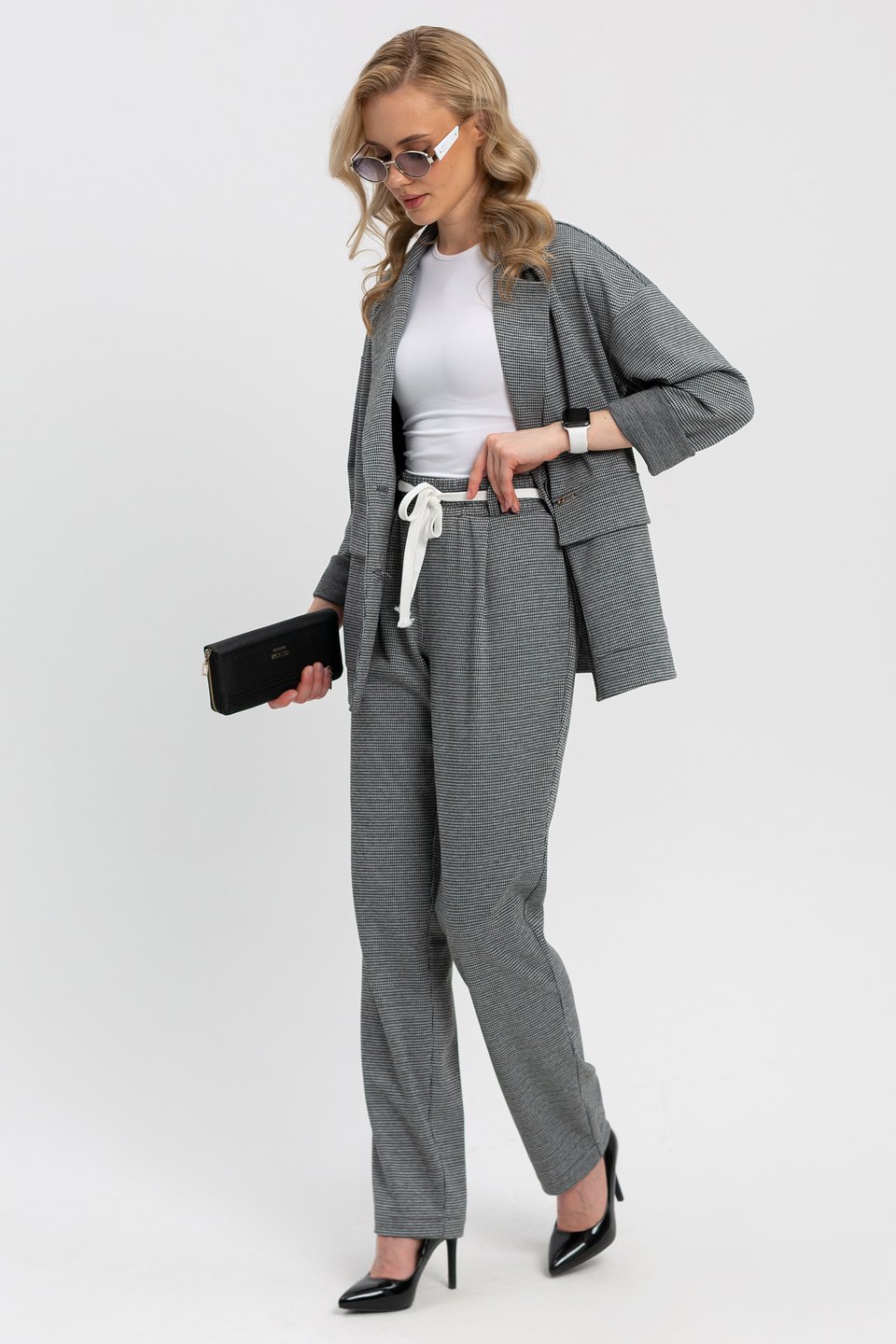 Костюмы в стиле спорт шик - любимая одежда современных покупательниц. Они удобные, комфортные и нарядные одновременно. Классический жакет отлично подружился с брюками спортивного стиля. Брюки с резинкой по талии и легкой складкой немного расслабляют, низ брюк загибается на манжет. Белый шнур, вставленный в шлевки, придает летнее настроение, полностью достается при желании. Жакет прямого силуэта, умеренного объема, спущенная плечевая линия, рукава отгибаются на манжет. Воротник пиджачного типа придает образу элегантности, строгости. Накладные карманы с клапаном. Состав трикотажа: 75% хлопок, 20% полиэстер, 5% спандекс.